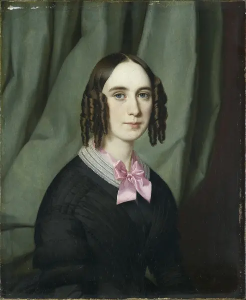 Brystbilde. Kroppen 1/2 profil, hodet 1/4. Hår brunt, hengekrøller. Ansikt gulblekt med svakt rosa. Øyne blå. Gråhvit blondekrage kantet med lilla silkebånd med sløyfe foran. Svart silkekjole med korsettmidje. Stoffet foldelagt fra skulderen på skrå ned mot livet. Rundt ermene to rader med svarte frynser. Krinolineskjørtet skimtes. Bakgrunn: Grønne nedhengende draperier med brune skygger. Til venstre mørk rødbrun flate.