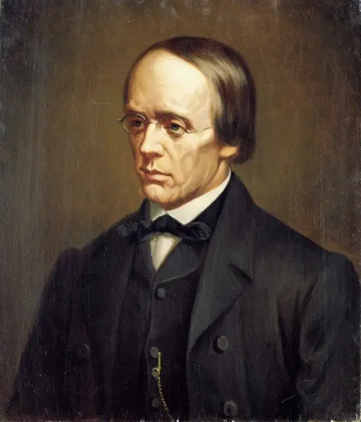 Brystbilde, 1/2 venstre profil. Hår brunt, glatt, forholdsvis langt og rett avklippet. Øyne gråbrune. Stålinnfattete briller. Ansikt brunlig med brune skygger. Skjorten grågul, snippen do, bløt, dobbelt. Gråsvart slips knyttet i tversløyfe. Vest og jakke mørk grå med brune skygger. Vesten har slag. Urkjede av gull fra andre vesteknapp. Bakgrunnen brun.