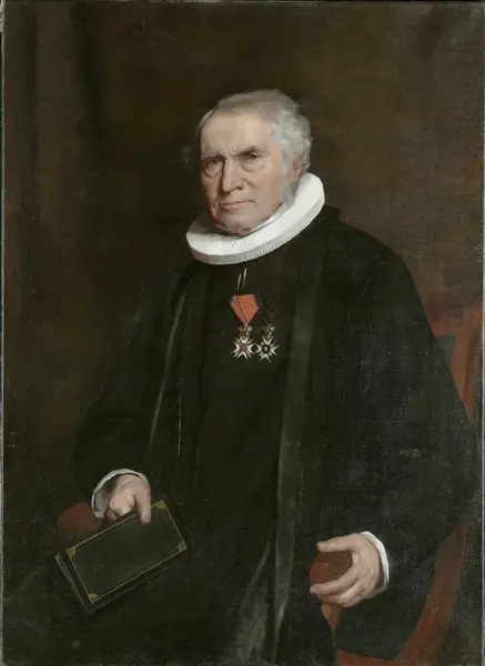 Sittende knebilde, svak venstre profil. Hår tynt og brunlig på issen, rikere og gråhvitt ved ørene. Grå whiskers. Øyne brune. Ansikt brunlig. Gulhvit prestekrage og svart prestekjole med St. Olav og Nordstjerneordenen på brystet. Han sitter i armstol med rødt treverk og holder en bok i høyre hånd. Bakgrunn mørk brun.