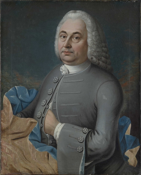 Hoftebilde. 1/4 venstre profil. Parykk gråhvit. Ansikt rosa. Øyne brune. Nese lang. Grå vest og frakk med svarte skygger, besatt med grå knapper foran og på ermene. Venstre hånd stukket inn i vesten. Lys brun kappe foret med blått ligger rundt livet og skjuler høyre hånd. Bakgrunn blågrønn.