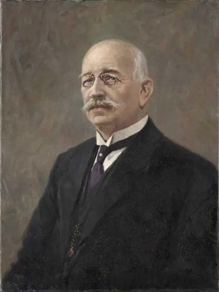 Brystbilde, 1/4 venstre profil. Skallet isse med gråhvit hårkrans med grønneskygge. Ansikt brunlig. Øyne sterkt blå. Lorgnett med gullinnfatning. Lys grønn mustasje. Gråhvit enkeltsnipp. Fiolett slips med nål i knuten. Gråblå jakke og vest. Fra øverste vesteknapp gull urkjede med rødt kors med hvite kanter. Bakgrunn hovedsaklig grønn med gule, røde og blå strøk.