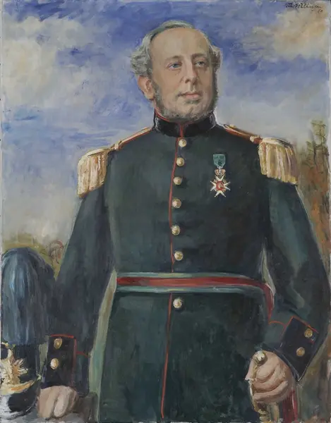 Hoftebilde. Kropp en face, hode svakt dreiet mot høyre. Hår grått med grønne skygger. Ansikt rødbrunt med grå skygger. Øyne blå. Fyldig munn. Grå skipperkrans. Grønn stadshauptmannuniform med blåsvarte skygger. Mørkblå enkeltkrage og ermeoppslag kantet med rødt. Gull epåletter. Enkeltknappet uniformsjakke med gullknapper og rød kant langs åpningen. Om livet grønt- og rødstripet skjerf. Venstre hånd holder om sabelskjeftet, høyre hviler knyttet på et bord. På bordet uniformsluen med høy, grønn dusk. Bakgrun malt som blå himmel med brungrå skyer. Til høyre skissert et landskap i høstfarger.