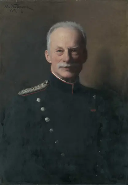 Hoftebilde, en face. Hår blågrått. Ansikt rødfiolett. Øyne brune. Mustasje grå. Iført brannsjefuniform med røde snorer og sølvknapper. På skuldrene tykke sølvsnorer med gullstjerne. Bakgrunn brungrå med rødt islett.