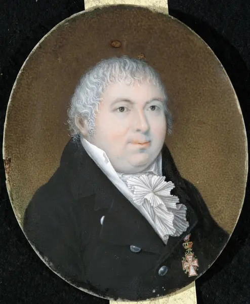 Brystbilde. 1/4 høyre profil. Hår grått, framoverbørstet. Brune øyne. Rundt, fyldig ansikt. Gråhvitt kalvekryss og do. vest med høy enkeltkrage. Dobbeltknappet blåsvart frakk. På venstre side Danebrogsordenen (den er trolig satt til etterpå).