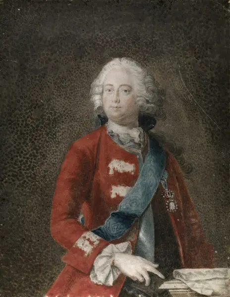 Stående hoftebilde, hode en face, kropp 1/8 h. profil. Gråhvit, krøllet parykk med stor blå sløyfe i nakken. Rød frakk med gråhvite possementer foran og på ermeoppslagene. Blå vest. Gråhvite blondemansjetter. På venstre siden en orden innfelt i briljanter og med kroen over. Blått ordensbånd fra venstre skulder tvers over brystet. Høyre hånd peker på en konsoll, hvorpå ligger et dokument. Bakgrunn gråbrun.