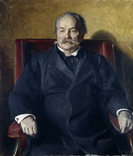 Sittende knebilde, en face. Grått hår. Grå mustasje. Brune øyne. Ansiktsfarge rød, fiolett. Snipp hvitgrå, stiv, enkel. Slips mørkegrått, knyttet i stor sløyfe. Mørkegrå jakke. Blåhvite mansjetter synlige. Sitter i rød armstol. Gulbrun bakgrunn.
