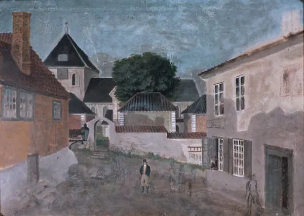 Kirken sett fra syd. Til h. innenfor kirkemuren sees familien Colletts gravkapell og litt av familen Leuchs. Til v. for porten ligger familien Vogts gravkapell. Langs muren går den bratte Kirkebakken, hvorfora Lille Kirkebakke går fram i forgrunnen. Her står en mann kledd i tidens drakt midt i gata. I et åpent vindu til h. sees også en mann. Flere personer er tegnet inn med blyant.