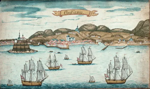 Midt på bildet øverst en vignett i gult med røde kanter hvorpå skrevet "Christiania". I forgrunnen 4 gulbrune seilskip og flere småbåter. En fantasifull fremstilling.