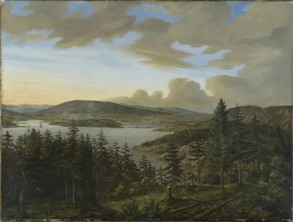Utsikt over Oslo sett fra Ljan. I forgrunnen granskog med hugstmark. Mellom trærne sees tømmerstabel. I bakgrunnen ligger byen malt i gult og rødt. Vår Frelsers krike malt grå. Rødgyllen solnedgang i vest, store skybanker i øst.