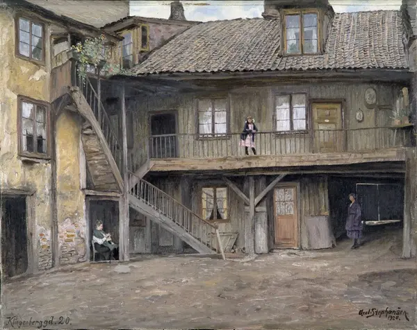 Gårdsinteriør, Under trappen til v. sitter en kone og strikker. I portrommet til h. står en dame i blåfiolett drakt. På svalgangen i 2nen etasje står en pike i rosa kjole.