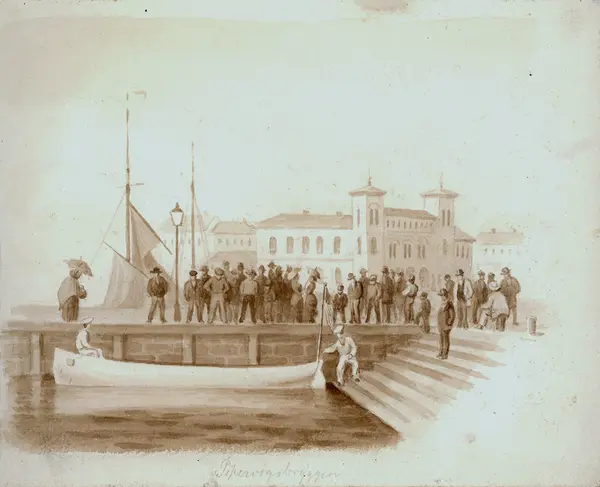 folkeliv, havn, gaster, amerikans flagg, flåtebesøk, vestbanen. På bryggen står mange mennesker og ser på en hvit båt med to gaster. Båtern har amerikanske flagg. I bakgrunnen Vestbanen.
