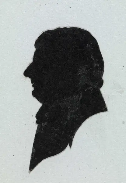 Klippet ut av svart papir og klebet på hvit, firkantet kartong. Hår kort. Nese lang. Dobbelthake. Høy uniformskrage.