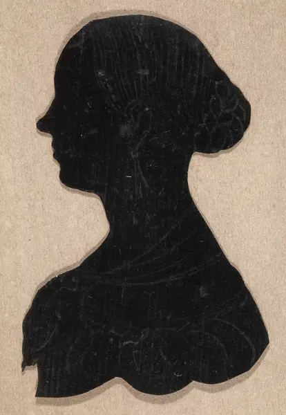 Klippet ut av svart papir klistret på gul kartong. Brystbilde. Hel v. profil. Håret delt på misten, samlet i topp i nakken. Lang, klumpet nese. Øredobber.