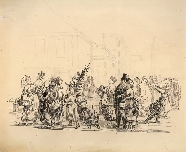 folkeliv, karikatur, handel, jul, torg, juletre, bygninger