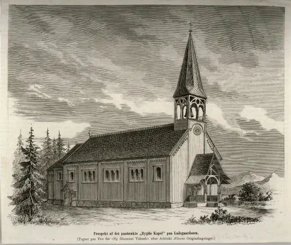 Prospekt af det paatænkte "Bygdø Kapel" paa Ladegaardsøen. /(Tegnet paa træ for "Ny Illustreret Tidende" efter Arkitekt Nissens Originaltegninger)