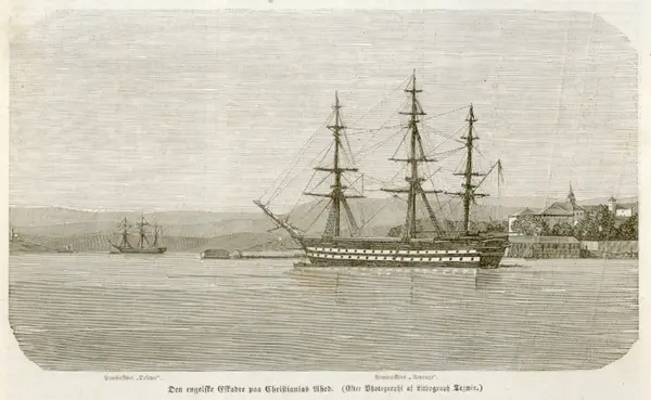 Pantserskibet "Defence".- Admiralskibet "Revenge". / Den engelske Eskadre paa Christianias Rhed (Efter Photographi af Litograph Tegnér)