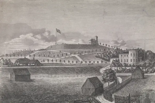Trykt under motivet: Vand-Bassinet paa Sankt Hans-Haugen i Kristiania, set fra Bjergstien. / (Tegnet paa Træ for Ny illust. Tidende af Kielland-Torkildsen.)