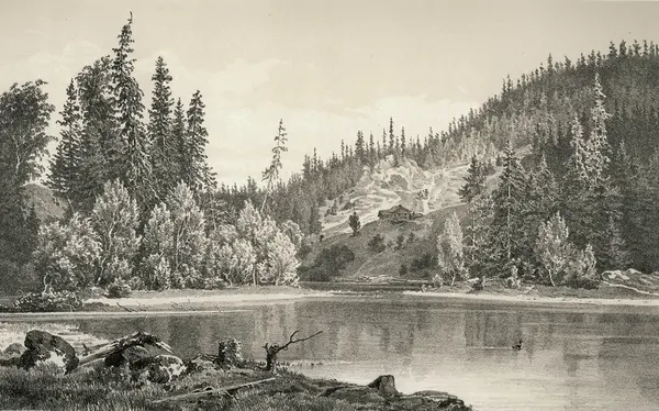 landskap, innsjø, vann, tjern, and, hytte, kløvhest