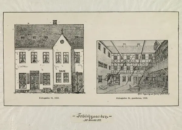 Kirkegaden 34, 1858. - Kirkegaden 34, gaardsrum, 1858 / Frølichgaarden / før branden 1858