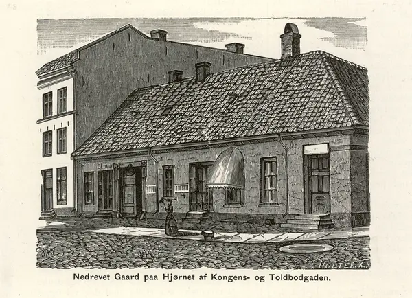 Nedrevet Gaard paa Hjørnet af Kongens- og Toldbodgaden