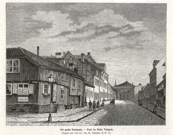 Trykt under motivet: Det gamle Kristiania. - Parti fra Nedre Vollgade. / (Tegnet paa Træ for Ny ill. Tidende av K.T.)