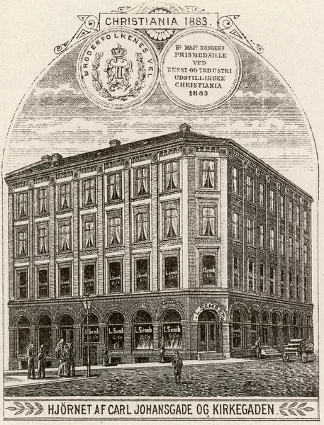 Christiania 1883 / Broderfolkenes Vel / [...] / Hjørnet af Carl Johansgade og Kirkegaden