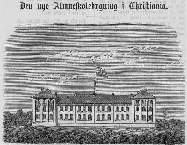 Trykt over motivet: Den nye Almueskolebygning i Christiania.