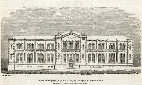Langlets Strothingsbygning: Facaden til Østregade; Indgangsport for Publikum i Midten. / (Tegningen er ved den xylographiske Udførelse bleven omvendt.)