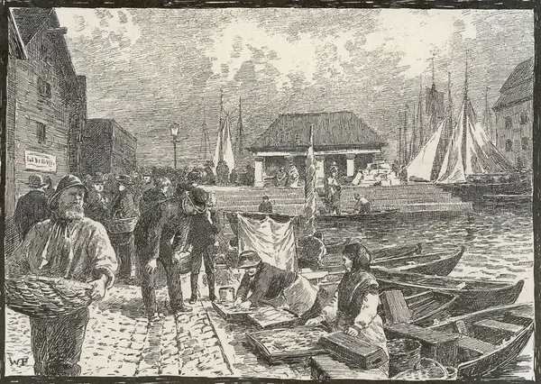 Den gamle Fiskebrygge i Kristiania. Efter Tegning af W. Peters