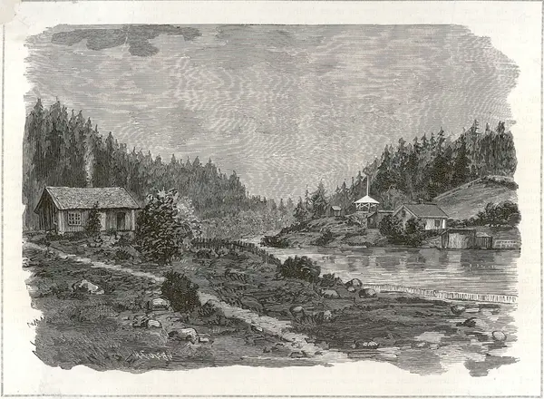 Grandalen ved Skydebanen. / Nydalens Compagines Brug. Efter Tegninger for Ny Ill. Tidende af L. Norberg.