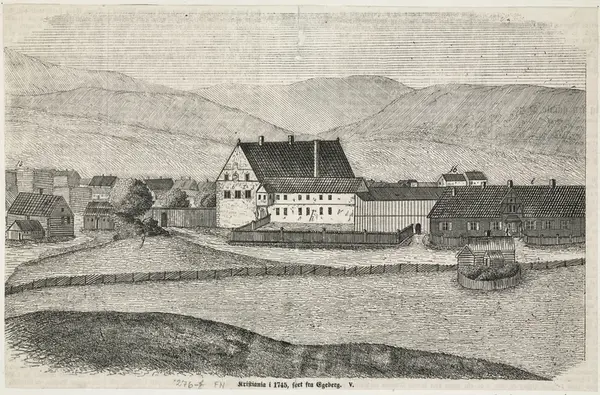 Trykt under motivet: Kristiania i 1745, seet fra Egeberg. V.
