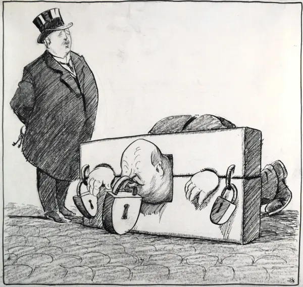 karikatur, mann, helfigur Diesen i gapestokken mens Søhr står ved siden av med nøkkelknippe på ryggen.