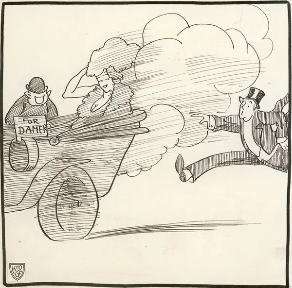karikatur, kvinne, mann, bil, snippkjole. En kvinner sitter i en drosje som bærer plakaten "For Damer" - en mann i snippkjole løper etter.