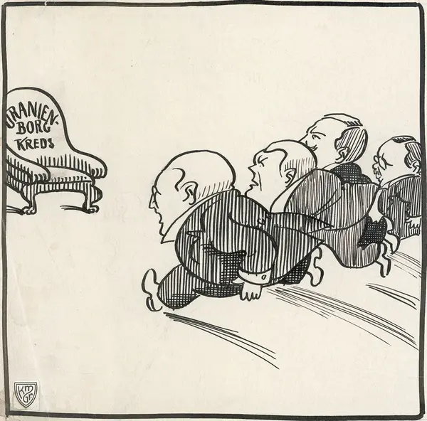 Karikatur av Nils Vogt, Jens Kristian M. Bratlie, Nils Yngvar Ustvedt og Fredrik Stang.
