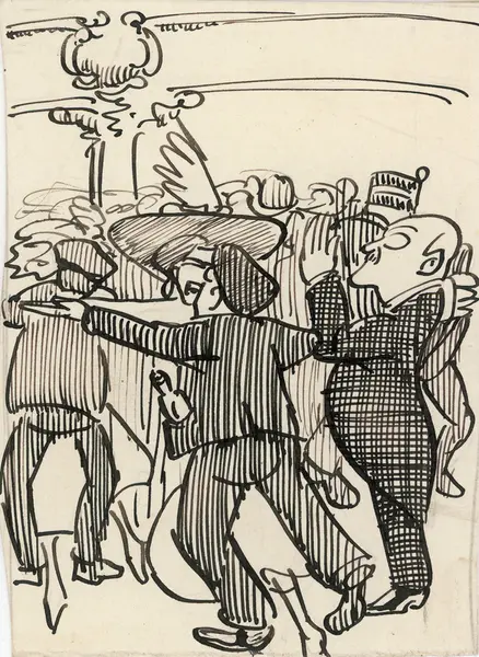 Karikatur av dans i Nationalteatret, teatersjef Halfdan Christensen inspiserer
