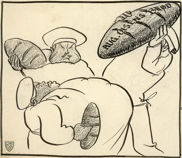 Karikatur av tre bakere med hvert sitt brød. Brødet til høyre er kjempestort og har på skrevet "AUG. OLSENS BRØD".