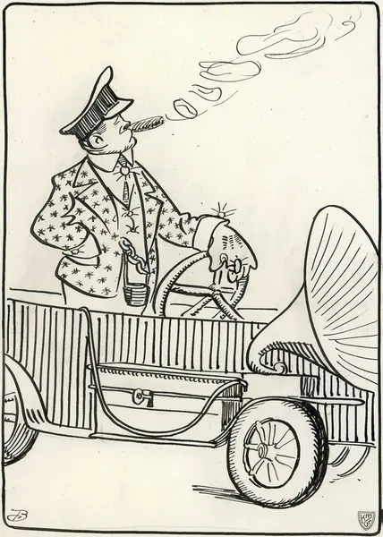 En herre står i en bil røkende på en stor sigar. Hånden som hviler på rattet har en stor ring på pekefingeren.