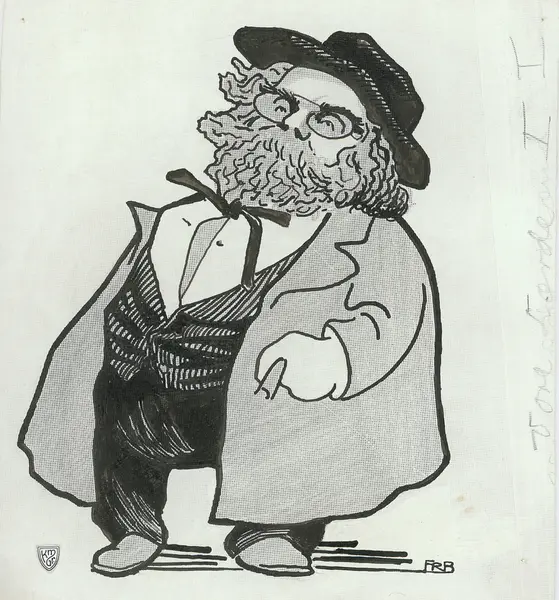 Hel figur, 1/4 venstre profil. Har briller og stort fullskjegg og langt hår. Iført rund, sort og åpen frakk.