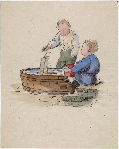 To gutter med en seilbåt i en stor balje med vann. Gutten til høyre sitter på en trapp.