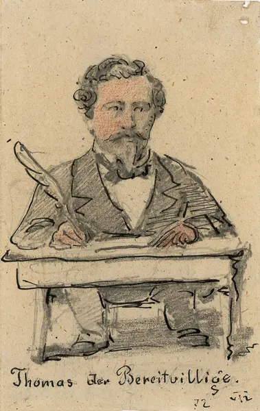 Sittende hel figur, en face. Sitter ved et bord og skriver med en fjærpenn.