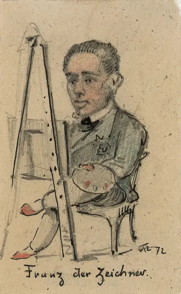 Sittende hel figur, 1/2 venstre profil. Han sitter med benene i kors foran et staffeli og maler. Har en palett i den ene hånden.
