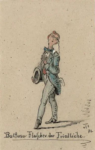 Hel figur, kroppen 1/2 venstre profil, hodet en face. Han står i dansepositur. Har monokkel og holder en flosshatt i den ene hånden.