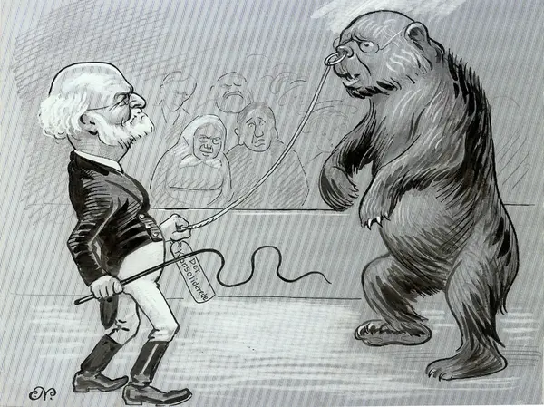 Berner opptrer som sirkusdirektør og holder Løvland, som er framstilt som en bjørn, i bånd.