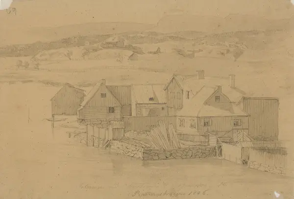 Helt nede ved dannkanten i forgunnenen ligger en husklynge. Bakenfor sees kupert terreng med spredt bebyggelse. Bakenfor høye åser.