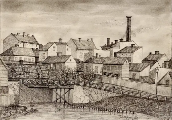 sett ovenfra mot Grünerbrua. Like bak broen sees taket på "Bomhuset", Nedregt. 2. Bakgrunnen opptas av en uregelmessig husklynge.