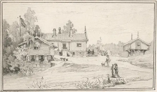 I forgrunnen står to personer og bakenfor en mann med en hund. På verandaen utenfor hovedhuset sitter to personer.