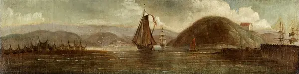 Fjord, seilskip, handelskip, fiskegarn, øy, brygge, fisker, landskap