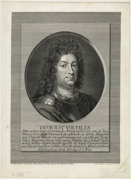 Trykt under motivet: Stukket efter et Orginal, hos Hans sönne sön Etate Raad Just Hendrich Voltelen. Meno Haas Sculpcit 1786.