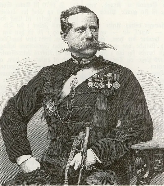 Sittende knebilde, kroppen en face med liten dreining til venstre, hodet 1/2 høyre profil. Kort hår, fremoverbørstet over ørene, stor mustasje. Iført uniform med mange ordner på brystet. Sitter med sin venstre arm hvilende på et bord.