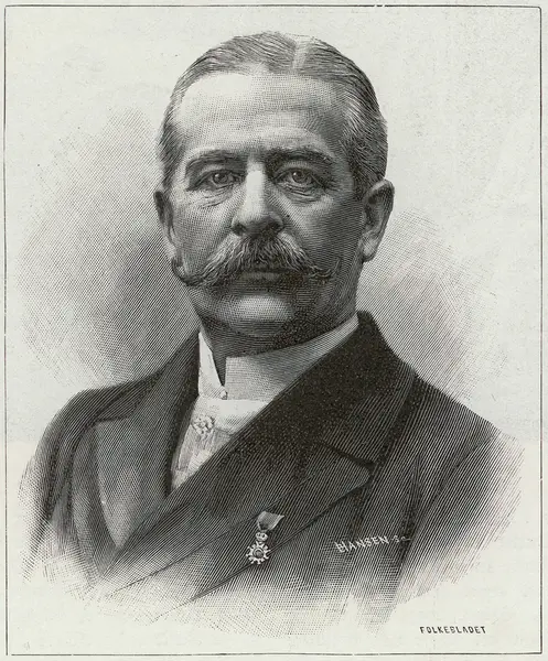 Brystbilde, kroppen 1/2 venstre profil, hodet en face. Kort hår, skilt på høyre side, stor mustasje. iført tidens drakt med ridderkorset av St. Olavsordenen på jakkeoppslaget.